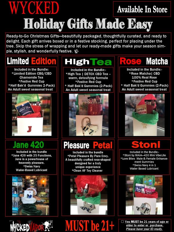 Wycked Vapor makes Christmas gifting effortless and chic with our beautifully prepared Ready-to-Go Holiday Gifts. Whether you’re choosing CBD favorites, Intimate Wellness essentials, or a mix of both, every gift arrives perfectly packaged or nestled in a cheerful stocking, ready to slip under the tree. Sharing joy with friends, family, or someone special has never been easier. Forget the hassle of wrapping and planning—our pre-made Christmas gifts keep your season effortless, elegant, and wonderfully merry.